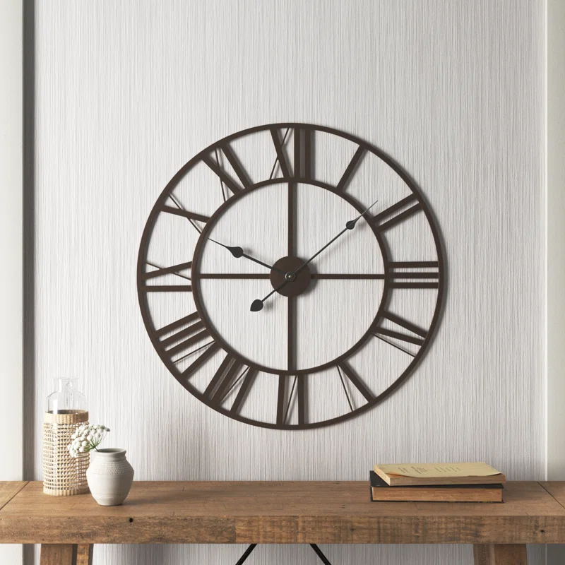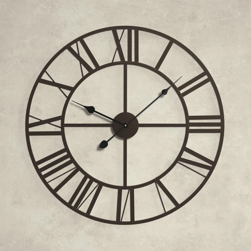 - This classic style wall clock features an open design with large, cut-out Roman numerals encircled by a solid iron frame. The Roman numerals are constructed from iron, as is the round center dial with spade-style hands.